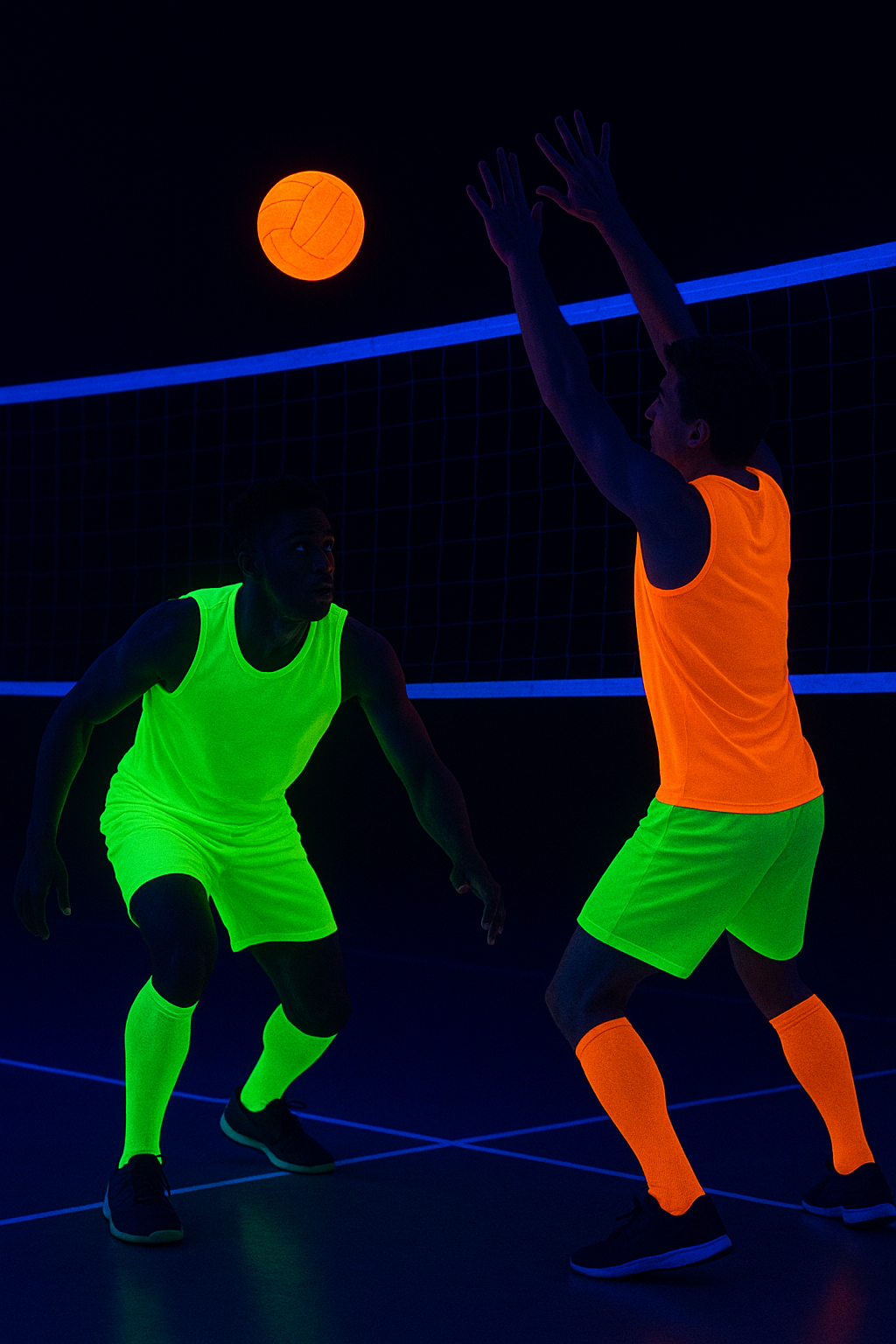 Markeer de lijnen en de bovenkant van het net met UV neon tape dat oplicht bij UV licht. Vraag of de spelers witte of neon kleurige kleding aan trekken en zorg dat de zaal goed donker is. Gebruik een Neon volleybal of markeer een gewone volleybal met UV neon tape.