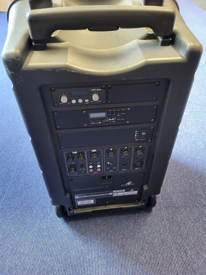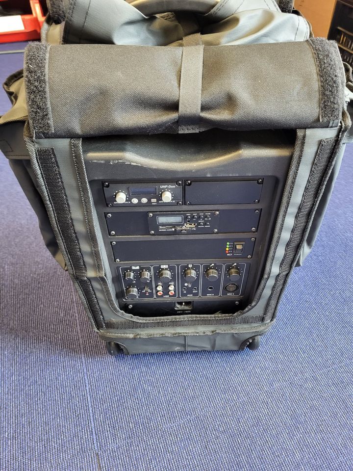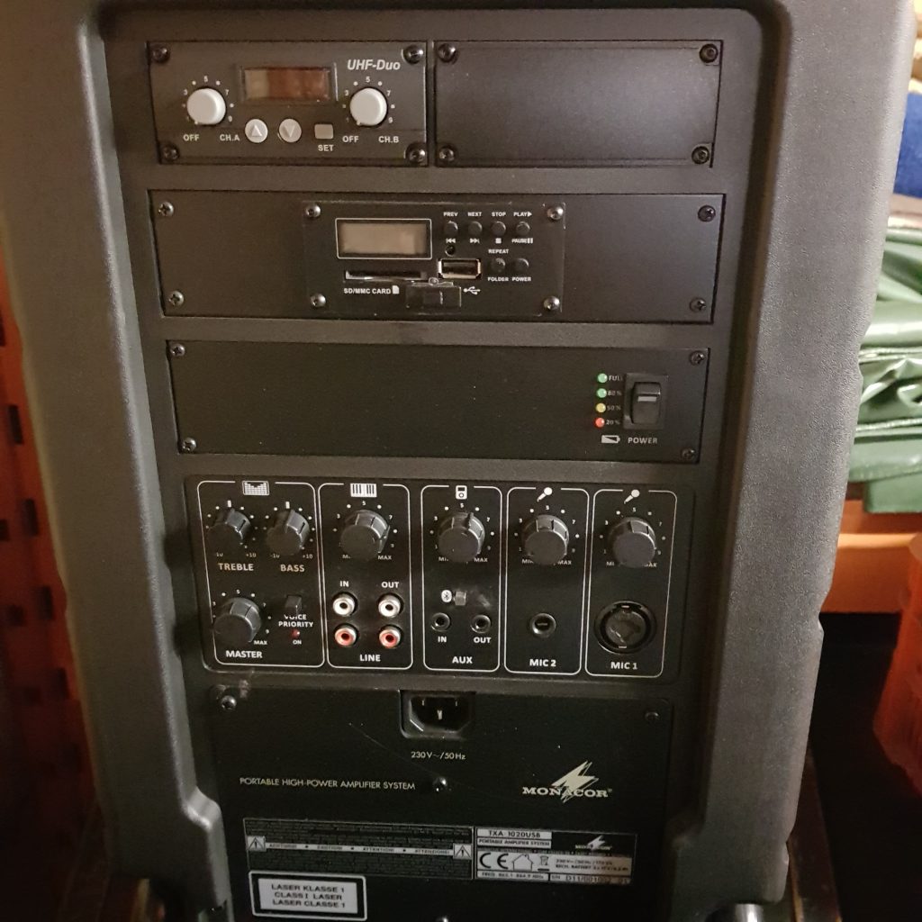 • Transporteerbaar High-Power versterkersysteem met geïntegreerde, instelbare 2-kanaals multifrequentie ontvangereenheid in UHF PLL-techniek en Bluetooth-ontvanger