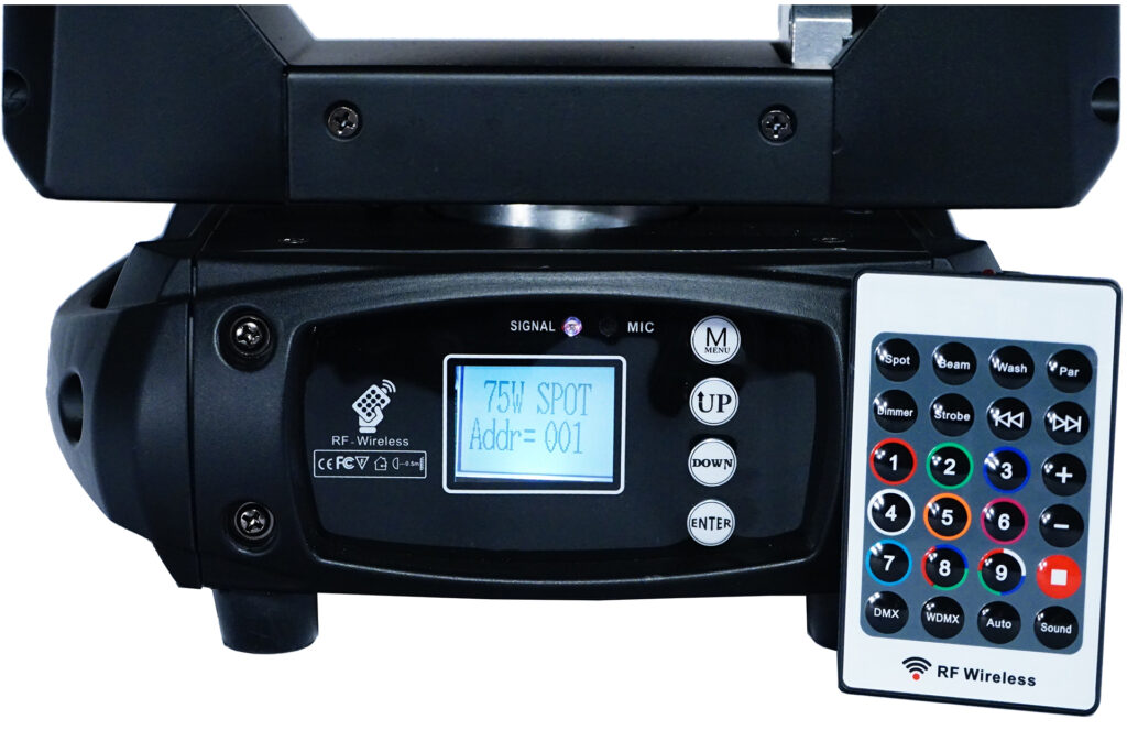 Led 75watt Spot Moving head, 8 colors , Rotating gobo wheel with 6 gobos plus open,2.5M-15M electric focus, 3 facet prism with variable speed and direction , powercon in/out ,11/13 Dmx channels.
