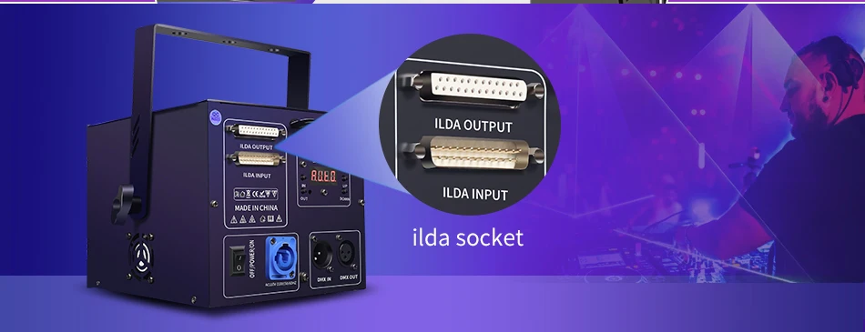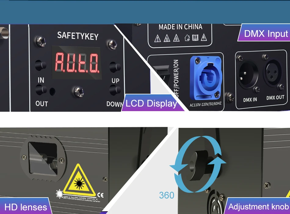 Besturingsmodi: geluidsregeling, automatische run, DMX 14/19 kanalen, master/slave-modus, ILDA-softwarebesturing