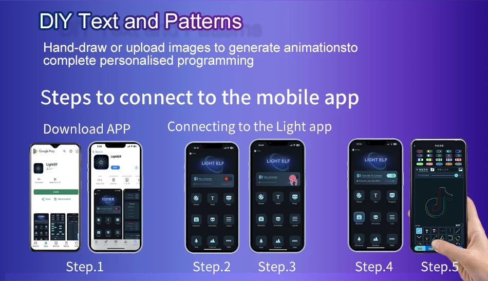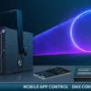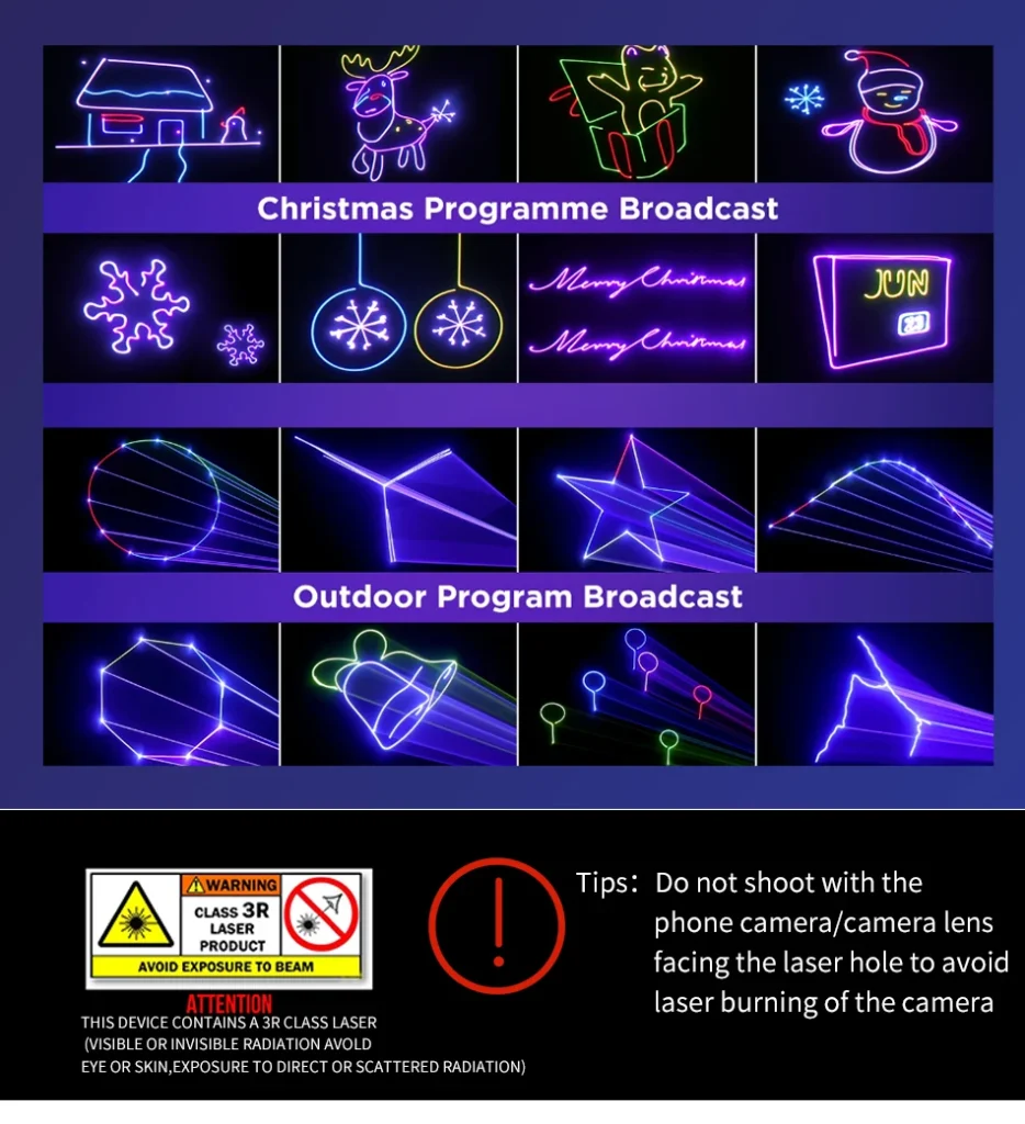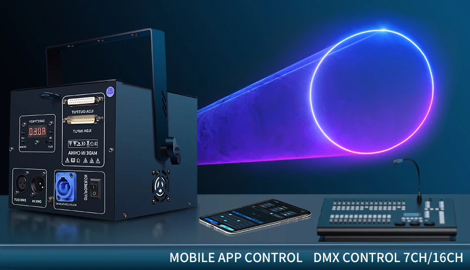 Besturing via DMX , Sound to light , ILDA , of de app in uw appstore (lightelf)