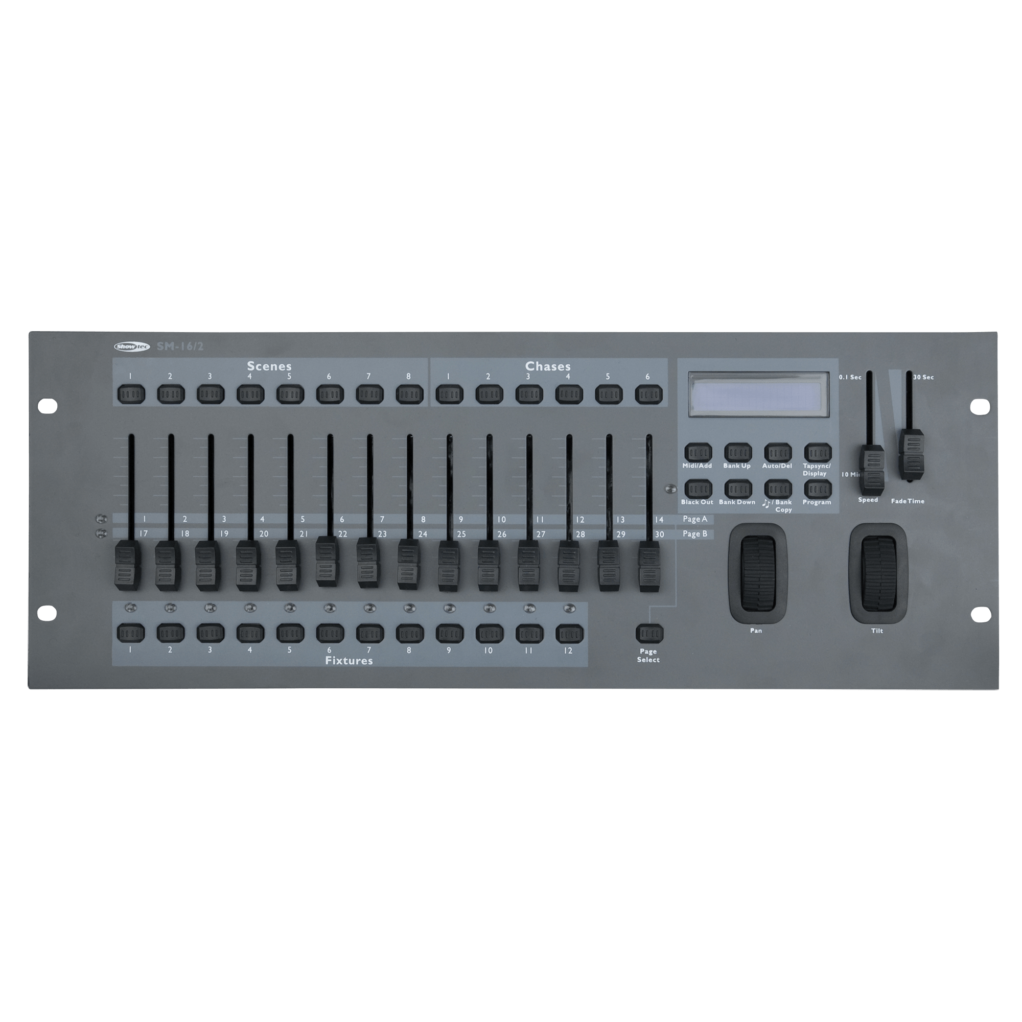 De SM-16/2 is de grotere broer van de SM-8/2. Hij kan intelligente fixtures tot 32 kanalen aan. Ook hier kan het 12 fixtures selecteren en 240 scènes en 6 chases programmeren. Voor een nauwkeurigere controle van de pan- en kantelbeweging is hij uitgerust met 2 jog-wielen. Ook voor de SM-16/2 kan elk kanaal worden gepatcht op elke fader of een van de twee jog-wielen.