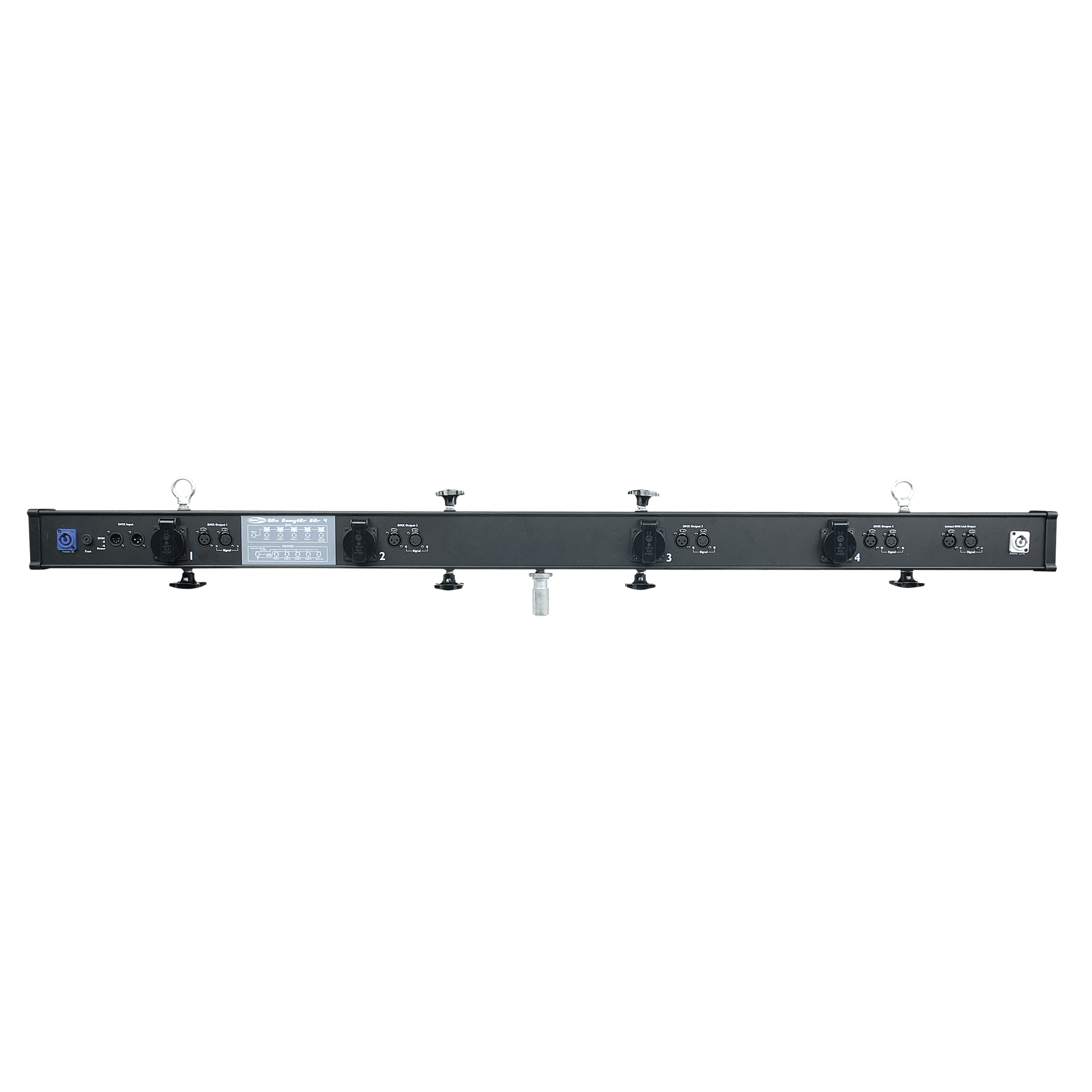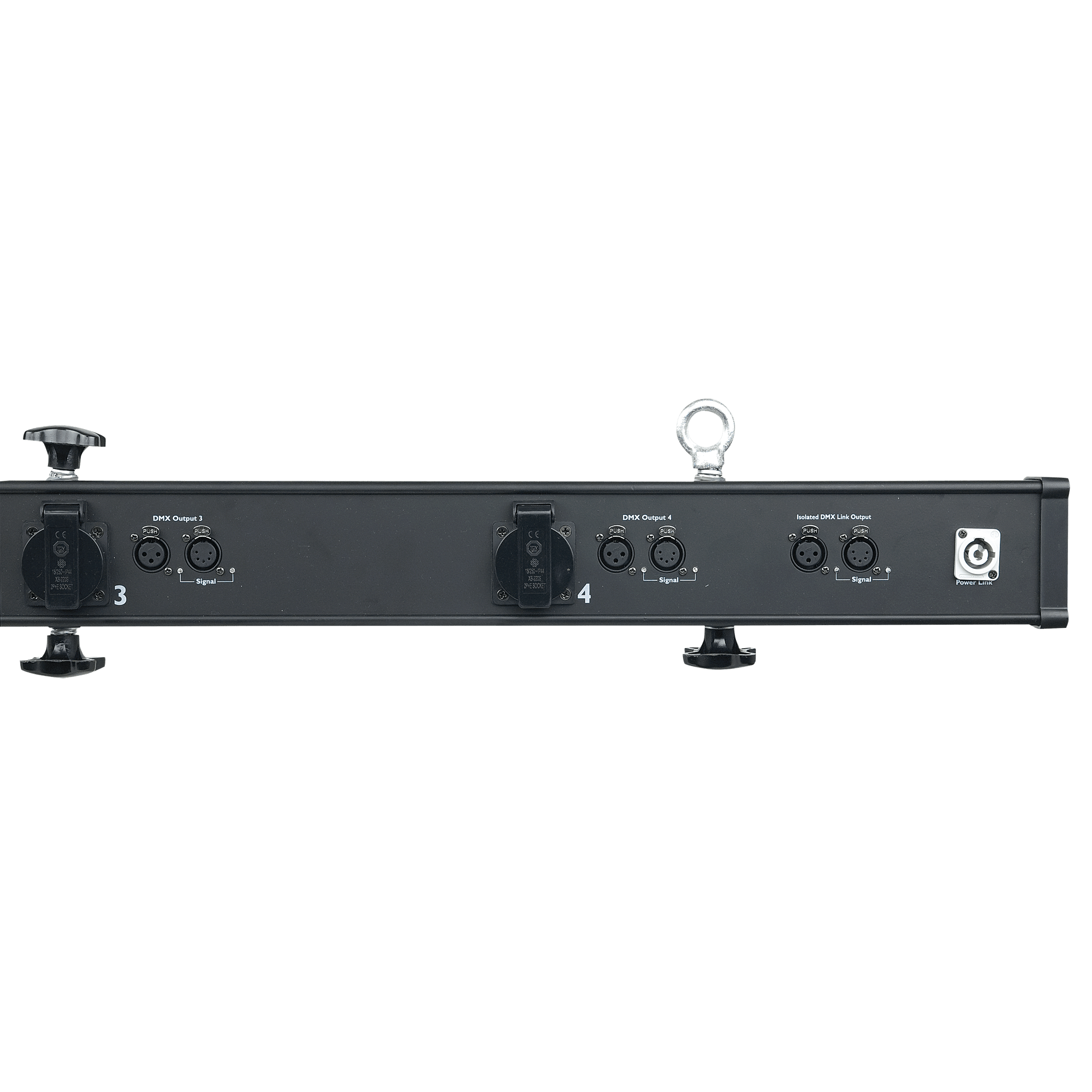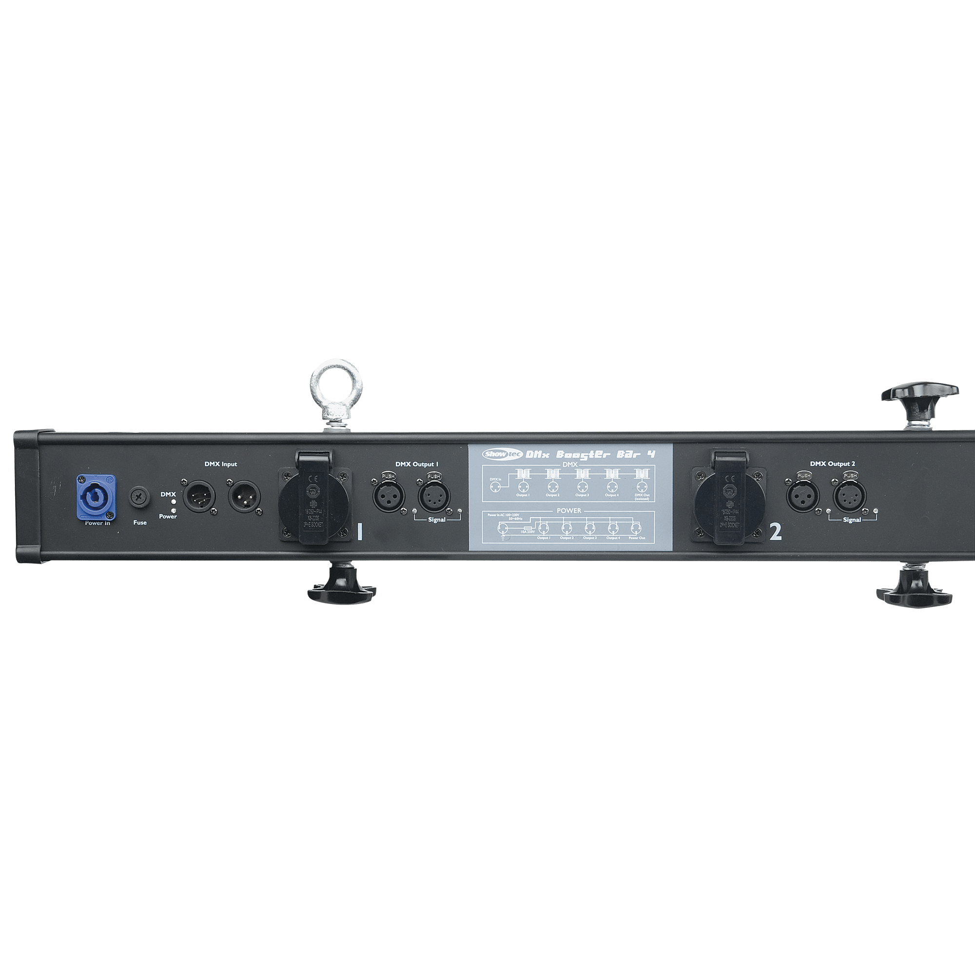De DMX Booster Bar is een 4-kanaals schuivende T-balk. Het heeft een Neutrik Powercon-ingang en -uitgang. Het heeft een 3- en 5-polige DMX-input. Het heeft in totaal 4 stuks 3- en 5-polige DMX-output en 1 DMX-link. Dankzij de ingebouwde versterker wordt elk kanaal geïsoleerd en versterkt zodat al uw fixtures het best mogelijke DMX-signaal ontvangen.
