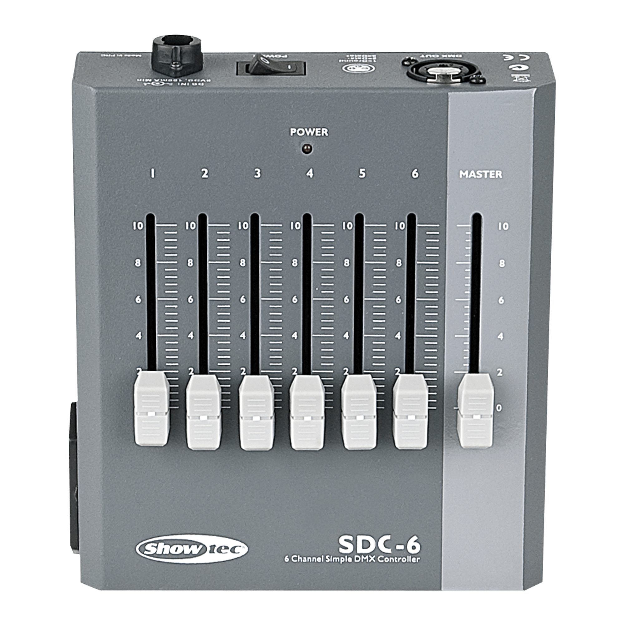 De SDC-6 is een kleine 6-kanaals DMX-controller die op batterijen werkt. Het is uitermate geschikt voor gemakkelijke toepassingen zoals tentoonstellingen, kleine winkels en evenals voor het testen van uw DMX-uitrusting.
