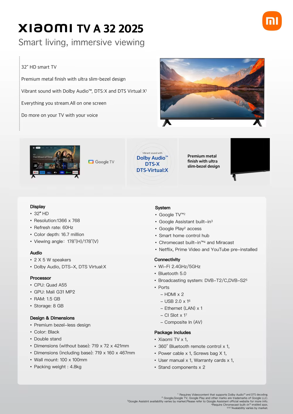 De Xiaomi TV A 32 heeft een compact formaat, perfect voor kleine ruimtes of slaapzalen, zonder dat dit ten koste gaat van de kijkervaring.